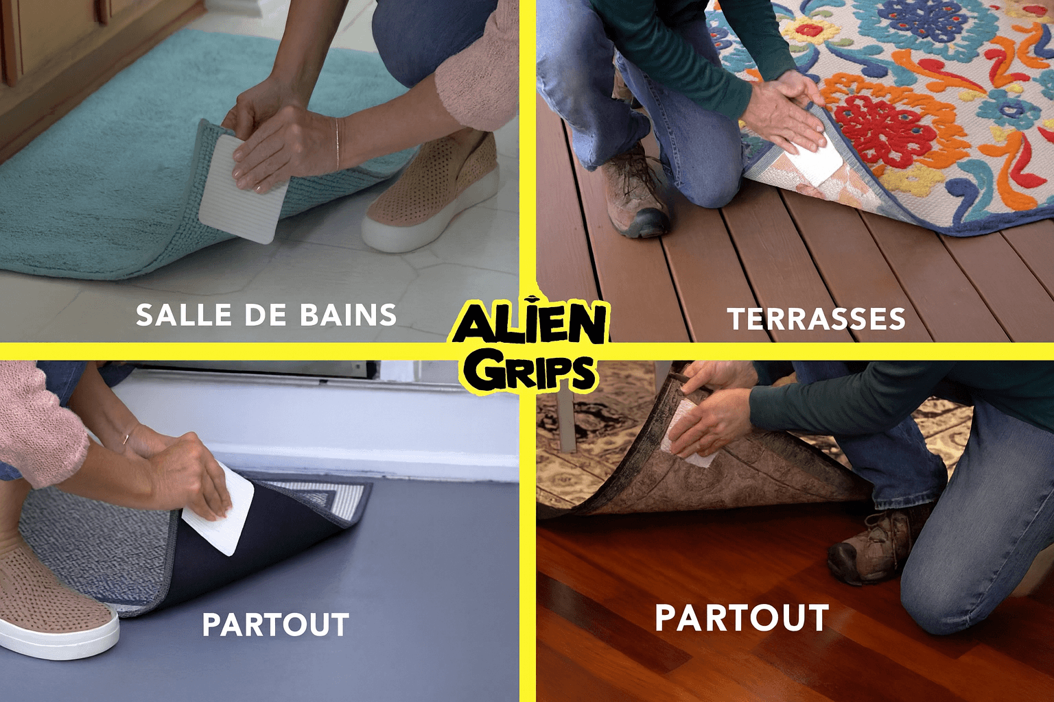 Les Alien Grips se verrouillent dans les tapis sans colles ni adhésifs - et de l'autre côté, notre pad spécial en caoutchouc adhère à tout sol ou surface.